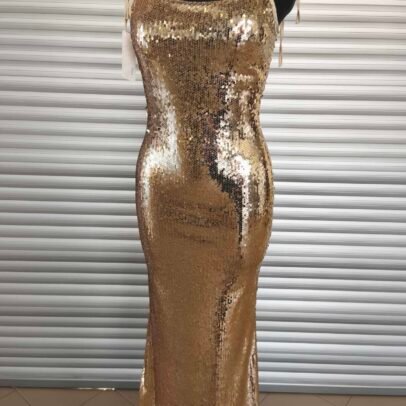 Auksu žėrinti ilga suknelė