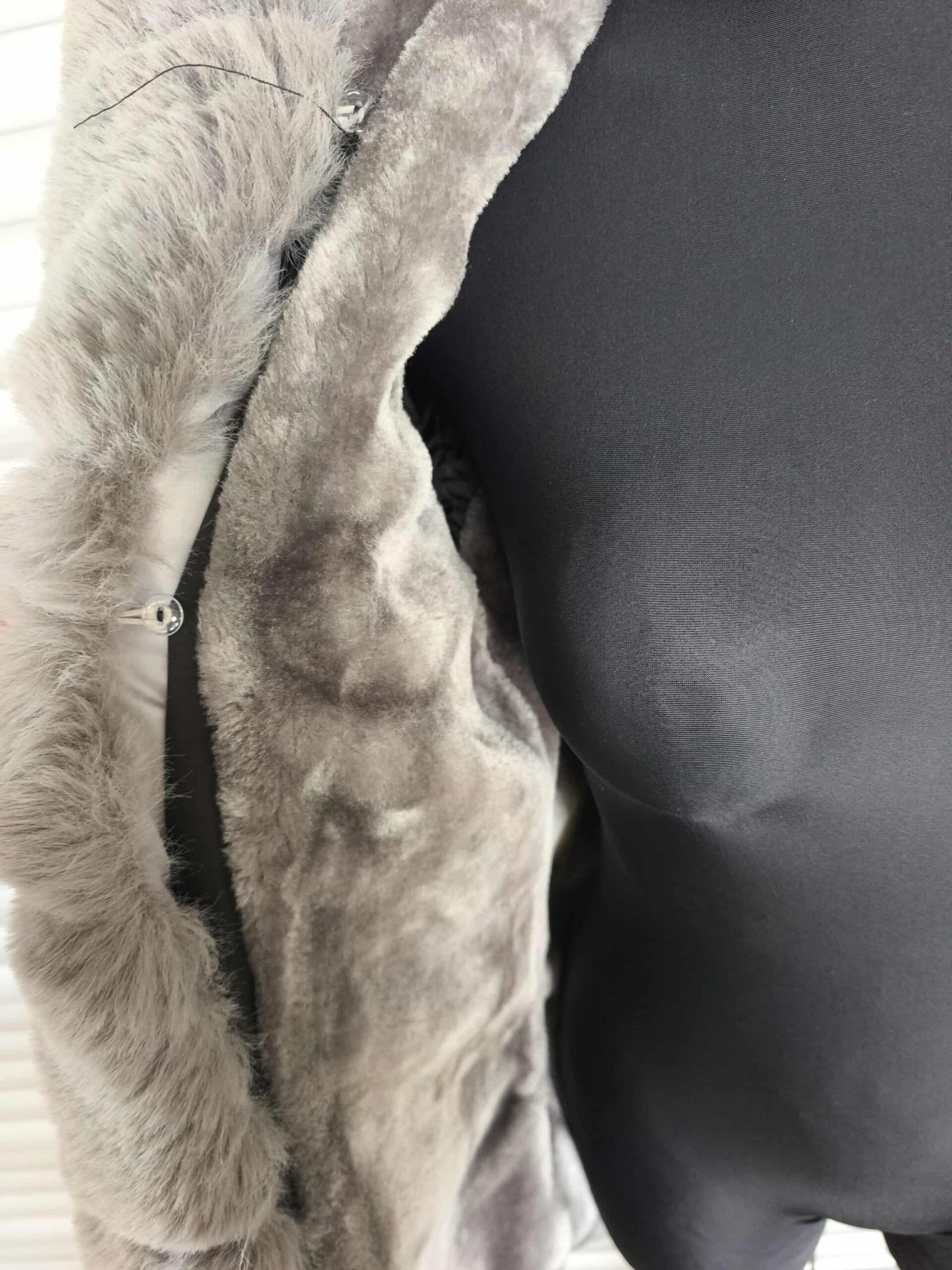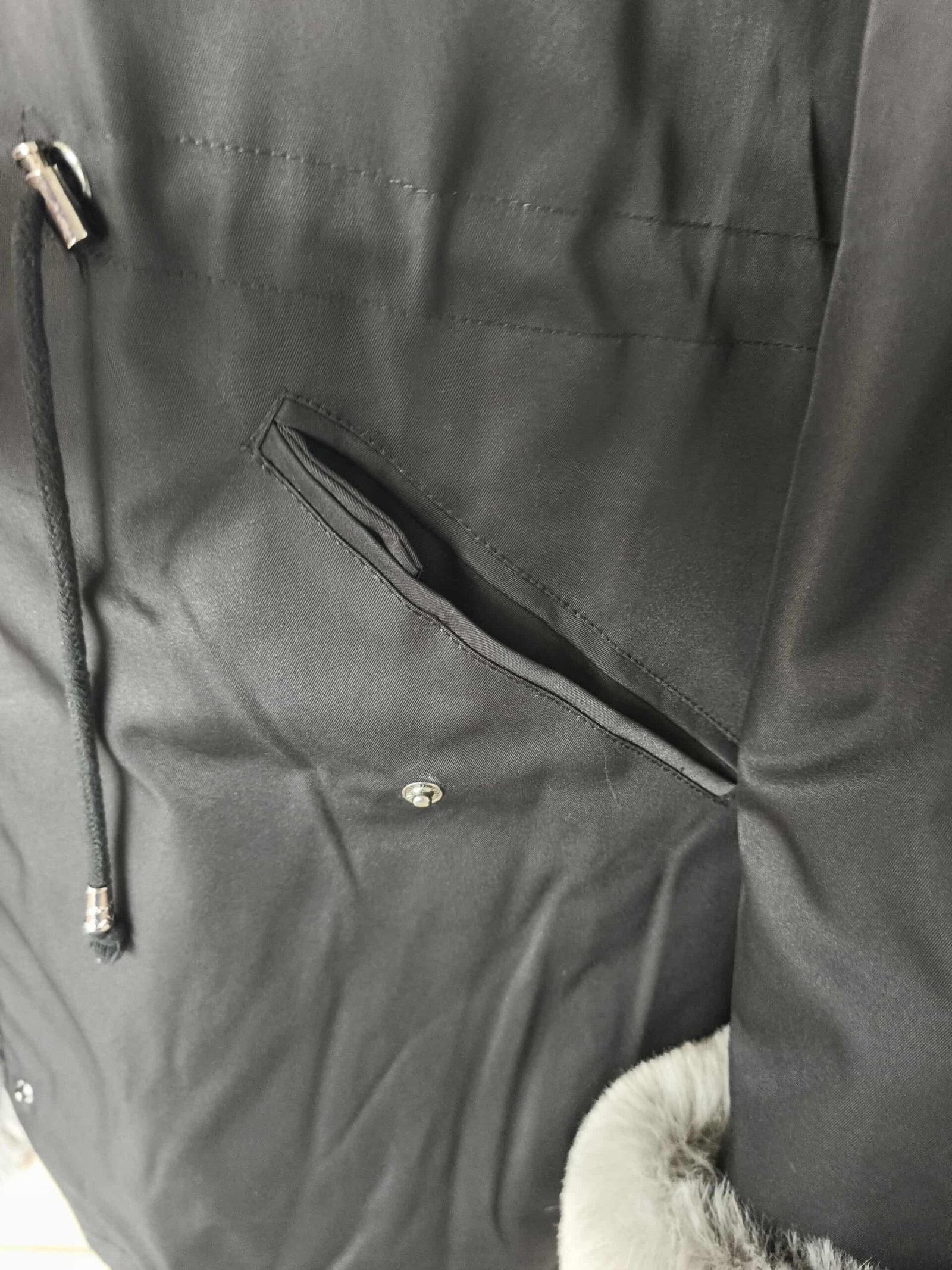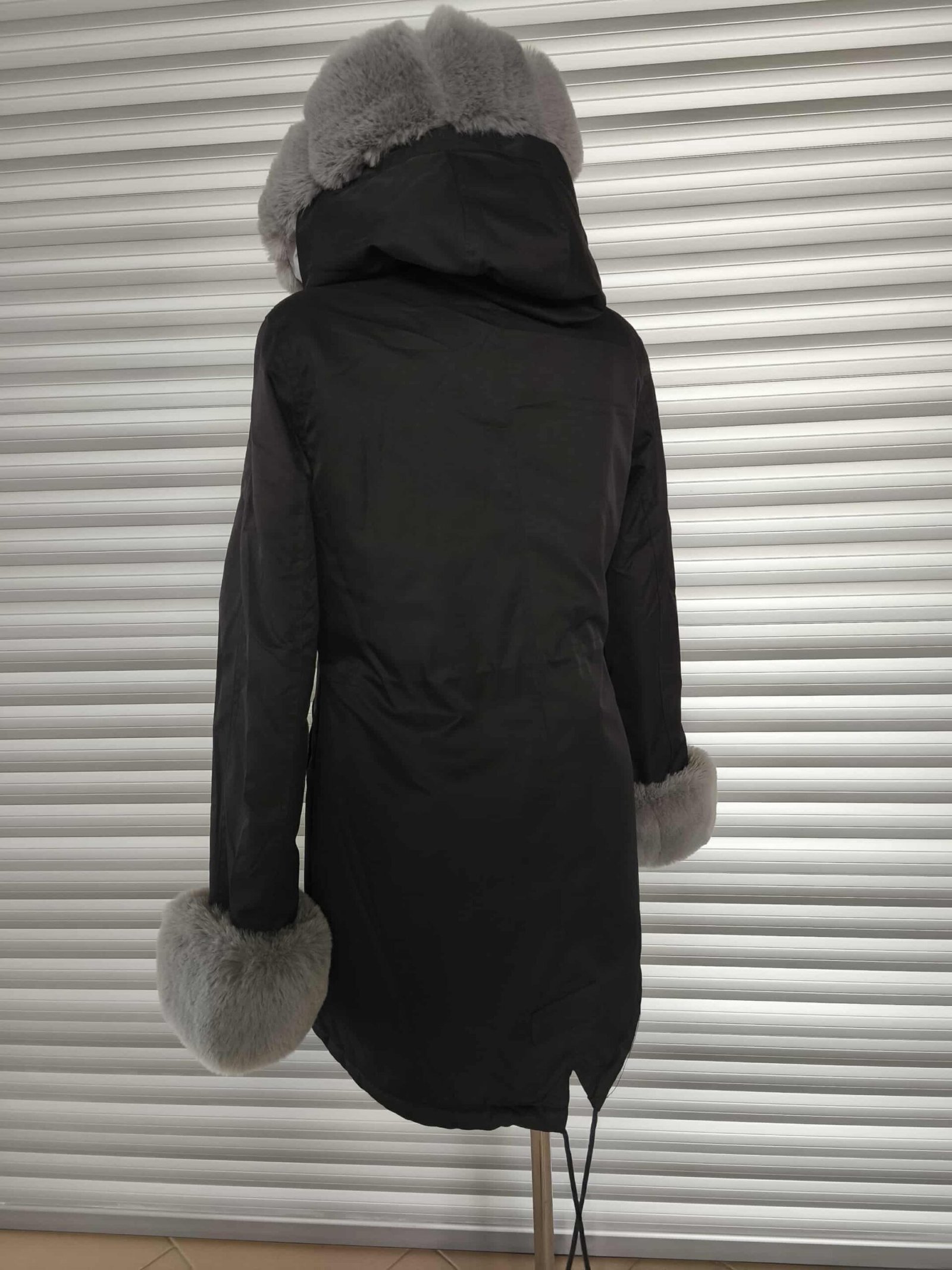 Šilta juoda striukė su pilku kailiu viduje – stilinga ir itin jauki!